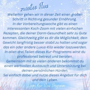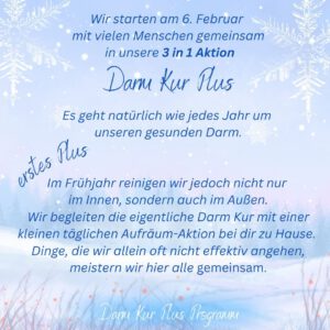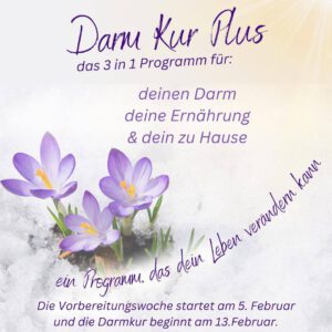 Wir starten im Februar mit einer großen Gruppe unser diesjähriges Darmkur-Plus-Programm. Die Vorbereitungswoche beginnt am 5. Februar, die eigentliche Darmkur startet am 13. Februar.